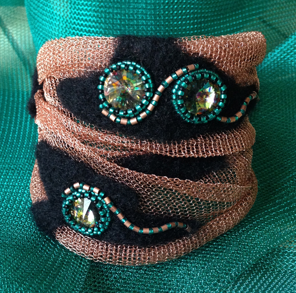 Jewelry-maker Pat Pawlowicz combines WireKnitZ with felting. She calls WireKnitZ “the perfect medium for felting”; its lightweight nature allows her to use magnetic clasps.