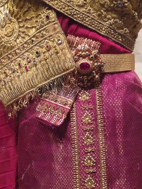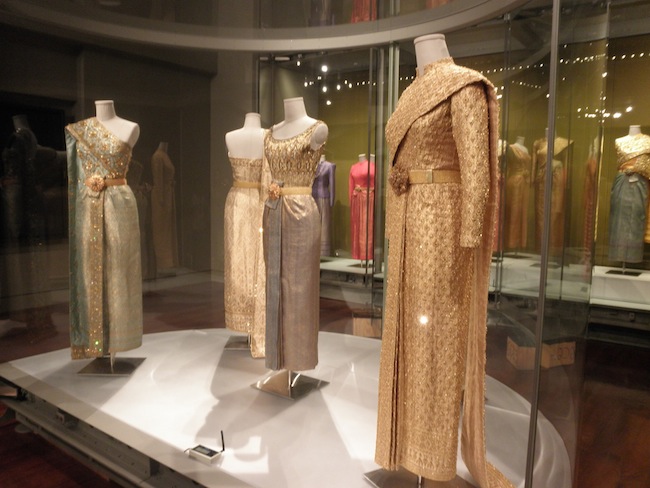 Interested, and wanting to learn the story behind the designs, I read the didactic panel: “In the 1960s Her Majesty’s team created a group of dresses based upon the wrapped and draped styles Thai women had traditionally worn—hip wrappers (phaa nung) and shoulder cloths (sabai)—but constructed according to Western dressmaking techniques. The result was a new national dress designed to honor the past while conveying a practical, modern Thai identity.”
