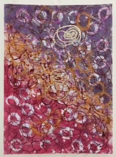 Inspired by mid-20th century abstract art, Mahlab’s current work is also abstract and usually begins with a collage of cut and layered fabrics — both her own hand-dyed and printed textiles and commercial fabrics. Recently, she has been experimenting with layers of sheer fabrics that have collaged textiles sandwiched between them.
