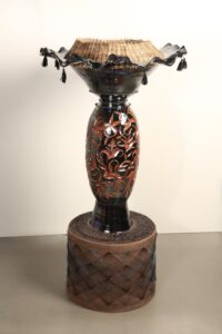 Anis Beigzadeh (she/her), Honor, 2025. Wheel thrown and hand-built ceramic with and handwoven fiber, basketry, Persian luster and nails, 56 x 28 x 28 inches. Photo by the artist. Graduate, Umass Dartmouth. anisbeigzadeh.com | @anis.beigzadeh