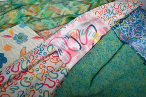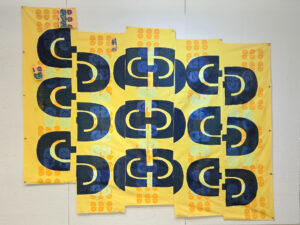 Delia Ngata (she/her), Lolotonga ‘Etau Tatali – While We Wait, 2022. Printmaking, garment construction and digitally etched silk habotai and cotton canvas, 59 x 157 inches. Photo: Emily Parr. Graduate, Auckland University of Technology.