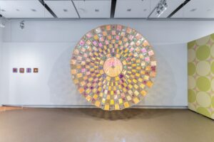 Merryn Omotayo Alaka (she/her), To hold, to bear, to witness, 2025. Sewn and quilted vinyl, cowrie shells, beauty supply store earrings and hair, 8 x 8 feet. Photo: Mikey Mosher. Graduate, The School of the Art Institute of Chicago. merrynalaka.com | @merrynalaka