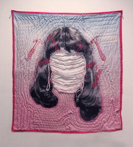 Emiko Kuhs (he/him), A God I Can Handle, 2025. Appliquéd cotton with batting and polyester thread, 31 x 37 inches. Photo by the artist. Undergraduate, Georgia State University. @Emiko.444