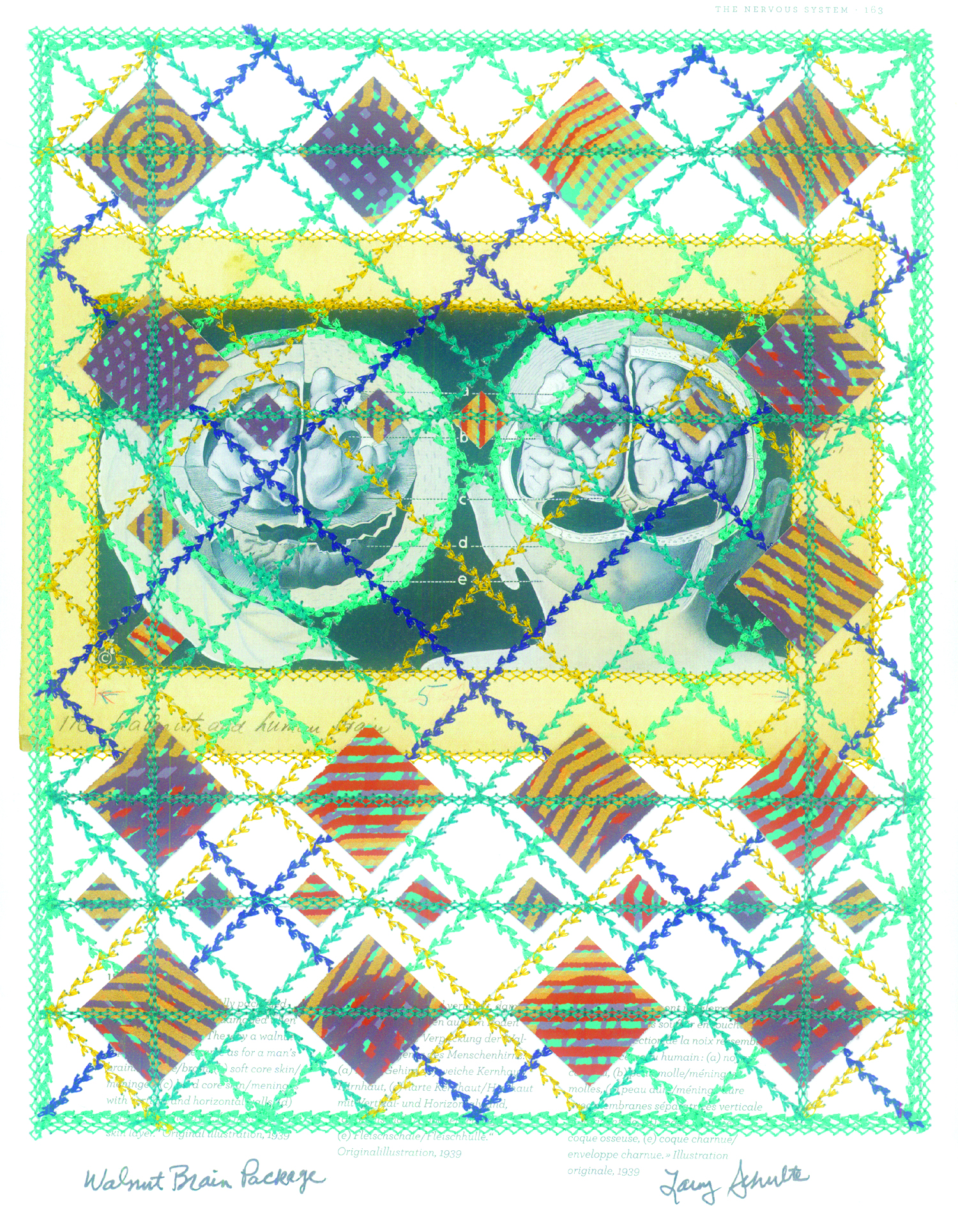 Larry Schulte, Walnut Brain Package, 2020-21, collage and machine stitching on book page, 12×9 March 9, 2021 Leave a Comment Cancel ReplyYou must be logged in to post a comment.