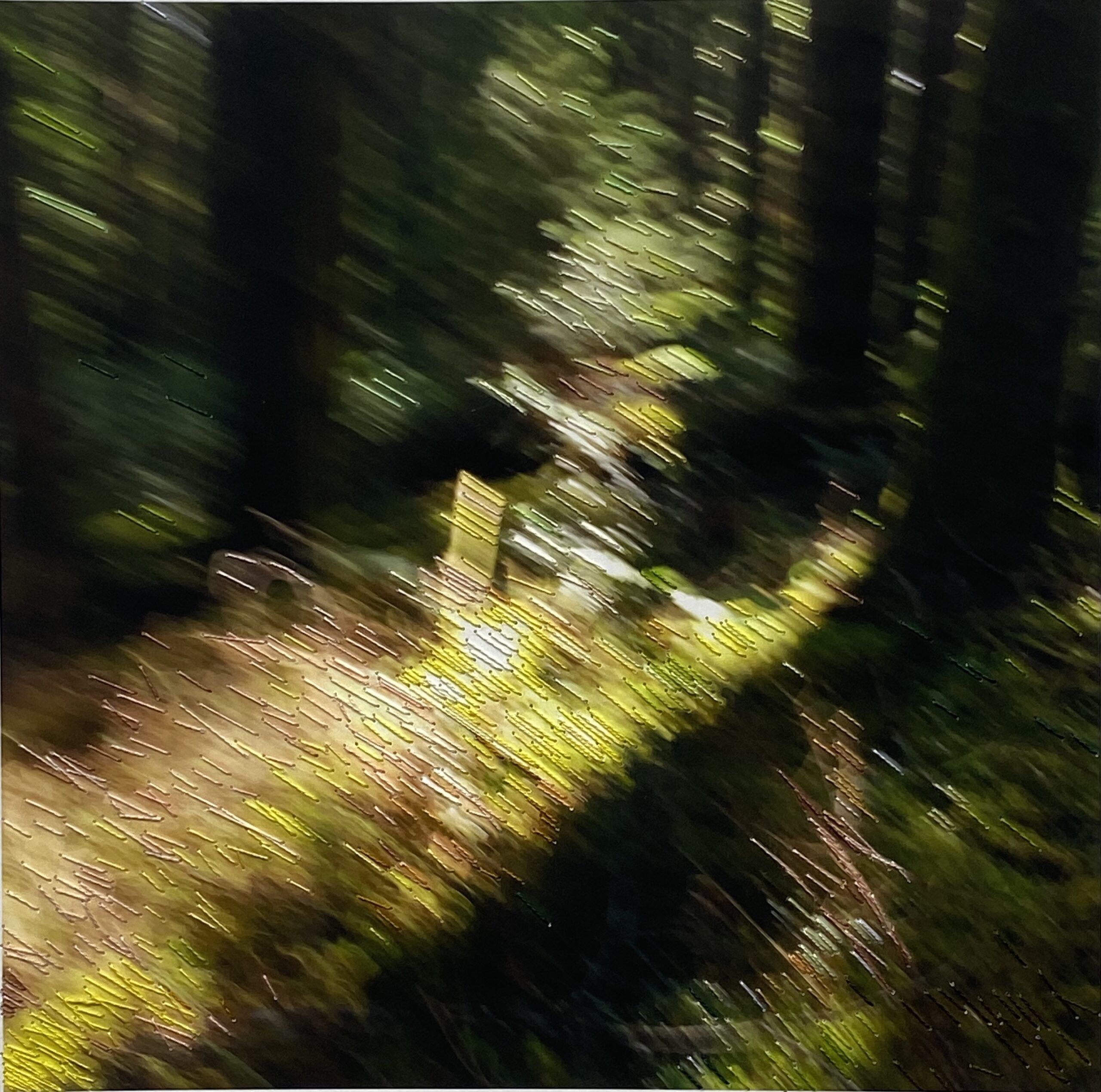 Image Statement: Light filters through the forest canopy. A moment expanded: caught in an instant and embellished with hours of stitching.
