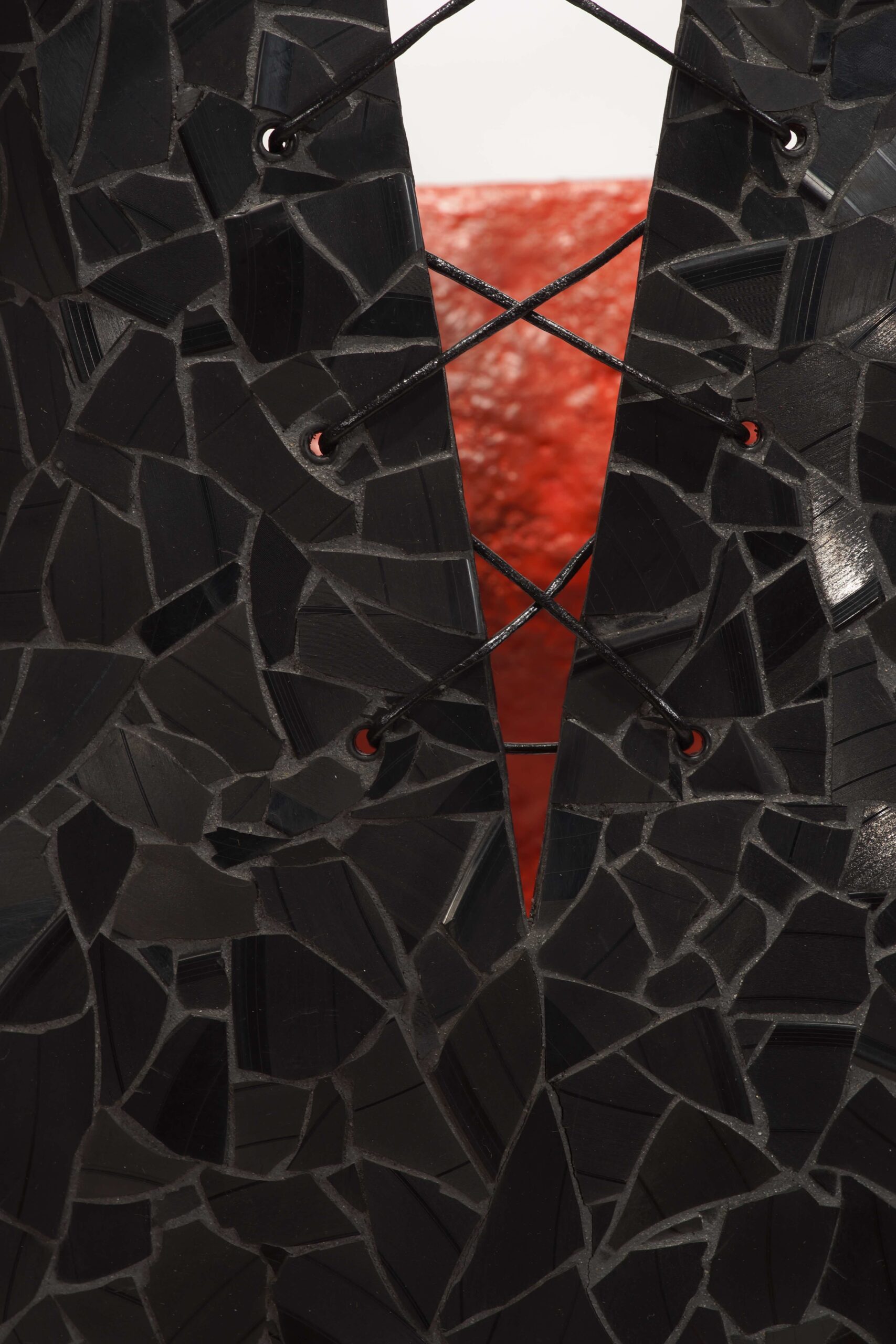 Materials: mixed media with handmade paper (cotton fibers, Elmer’s Glue, wax, leather, acrylics, grout, LPs)