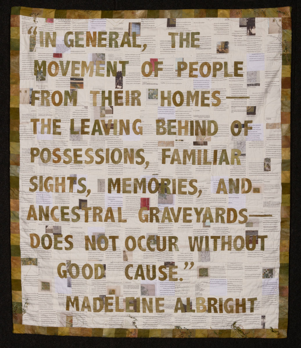 Image Statement: The fabric of the quilt contains the pages of my Master of Fine Arts thesis printed onto fabric, cut and re-pieced. The cutting and reassembly shift the readable text into a jumble both revealing and concealing the meaning. The quilting is done in white to subtly reveal the words This Land is My Land; This Land is Your Land in repeat. My thesis explored my journey through graduate school to explore how my hidden heritage impacted the art that made and the focus on finding home and building connection with nature. I uncovered a heritage of feeling dislocated and homesick that was passed down from my great grandparents to me. In the United States, we understand on a certain level that most of us are descended from immigrants, but we don’t know what that means. My own family came from Sweden and Finland to the US. The Finns came after many years of famine, lack of work and land, and conscription into the Russian army. It wasn’t a good time back home. When they left, it was for good and there were loved ones they never heard from again. When I hear the stories and the voices of current immigrants and refugees, I can’t help but think about my own family and what was given up to fit in. The quilt form is a very powerful object that already contains notions of home, family, and comfort. This work explores home, maps, directions, hidden stories, and searches for connection to a new country.