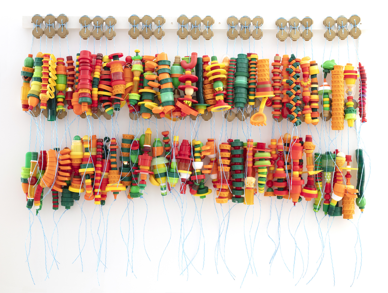 Materials: Cider Six Packs and various single use bottle caps strung and knotted with blue and white polyurethane rope