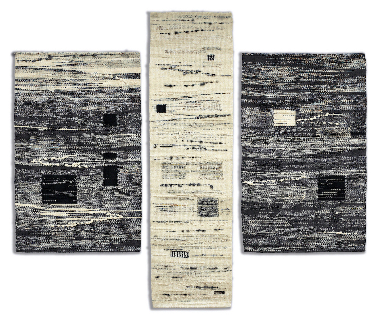Image Statement: Real News is a tribute to the journalists who, despite attacks levied against them, help protect our democracy by ferreting out and reporting the facts of a story. This triptych is woven in the traditional black and white of our daily newspapers and is designed to reflect columns and images. Materials include cotton, wool, Tencel, fabric scraps, newspaper strips and ribbon.