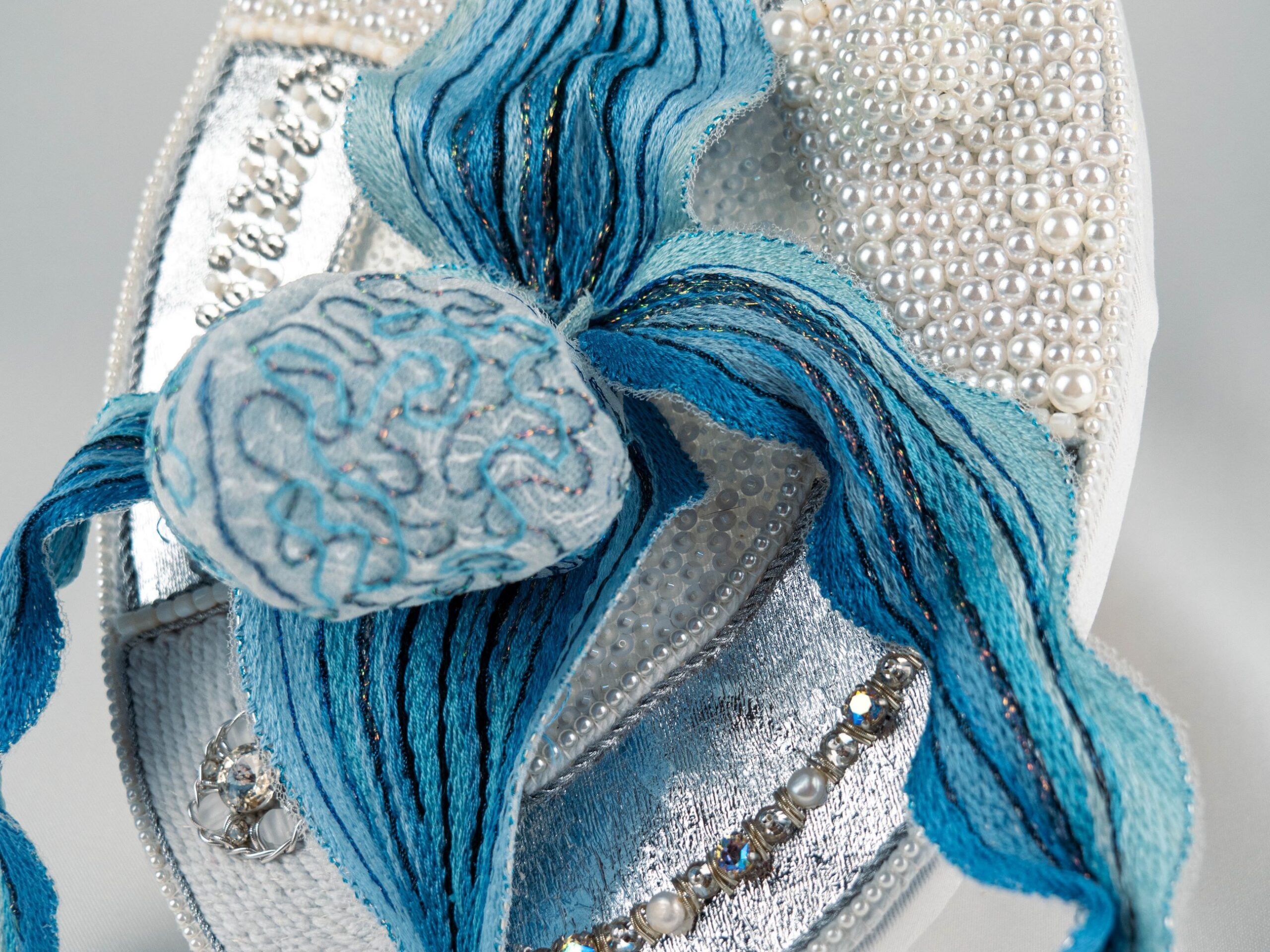 Materials: Beads (various shapes and sizes), mother-of-pearl beads, cotton, silk and metallic threads, sequins, braided metallic cord, foil, lace, French wire, rhinestones