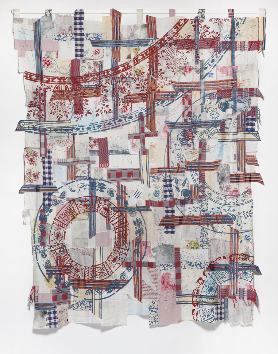 Image Statement: Snippets of textiles saved from my dining room and kitchen evidence an active life of cooking and eating with others. My kitchen implements and tableware are rendered in embroidered outlines and surrounded by thread tick marks calling attention to the frequency of their use and memories of past shared meals. Large stenciled patterns inspired by handed-down china reference the traditionally female art of china painting — an accepted female employable skill during a historical period of limited for women's enfranchisement.