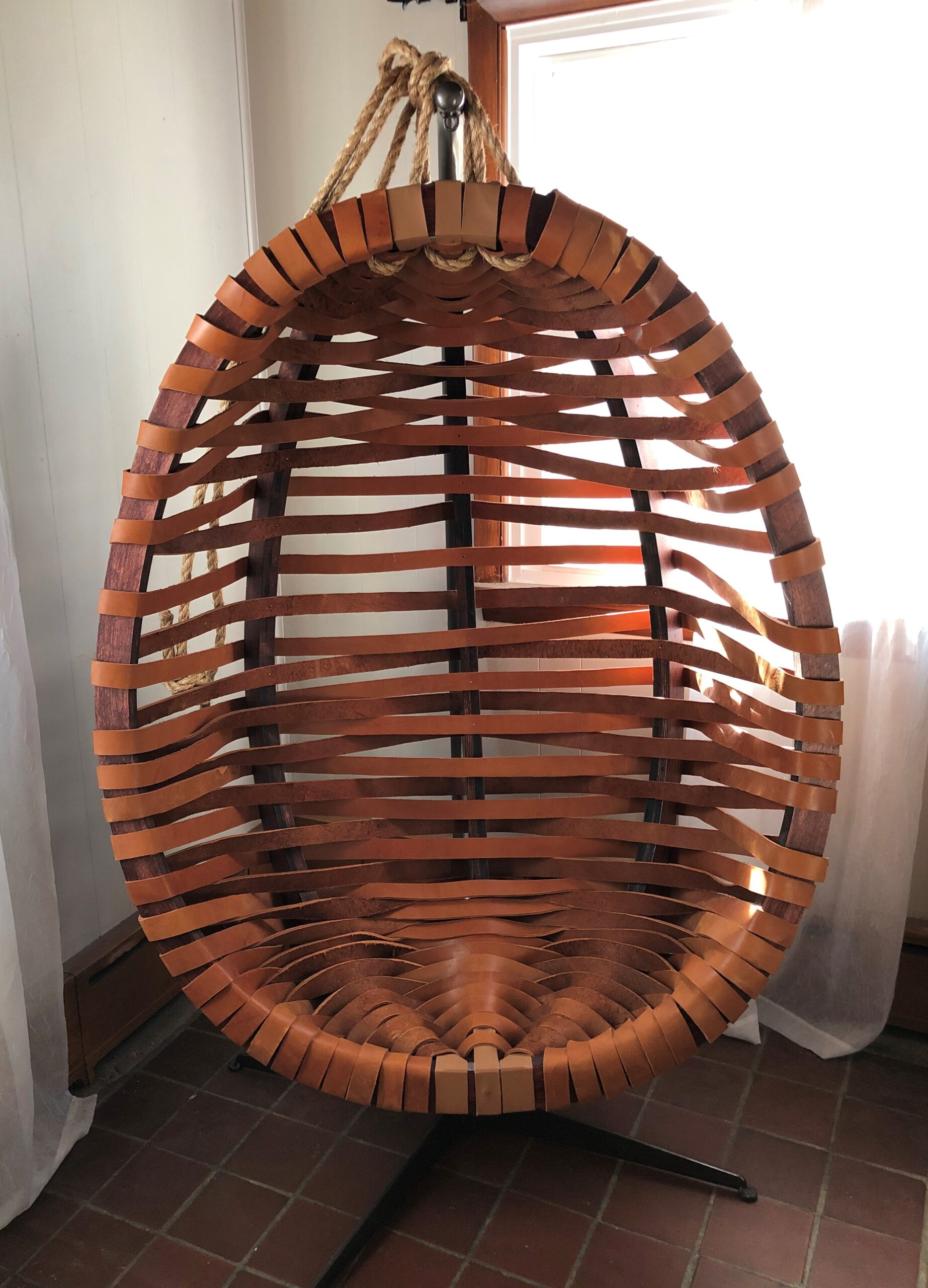 Image Statement: Womb Chair, vegetable tanned cowhide leather weaving on hand cut wooden frame with brass furniture tacks
