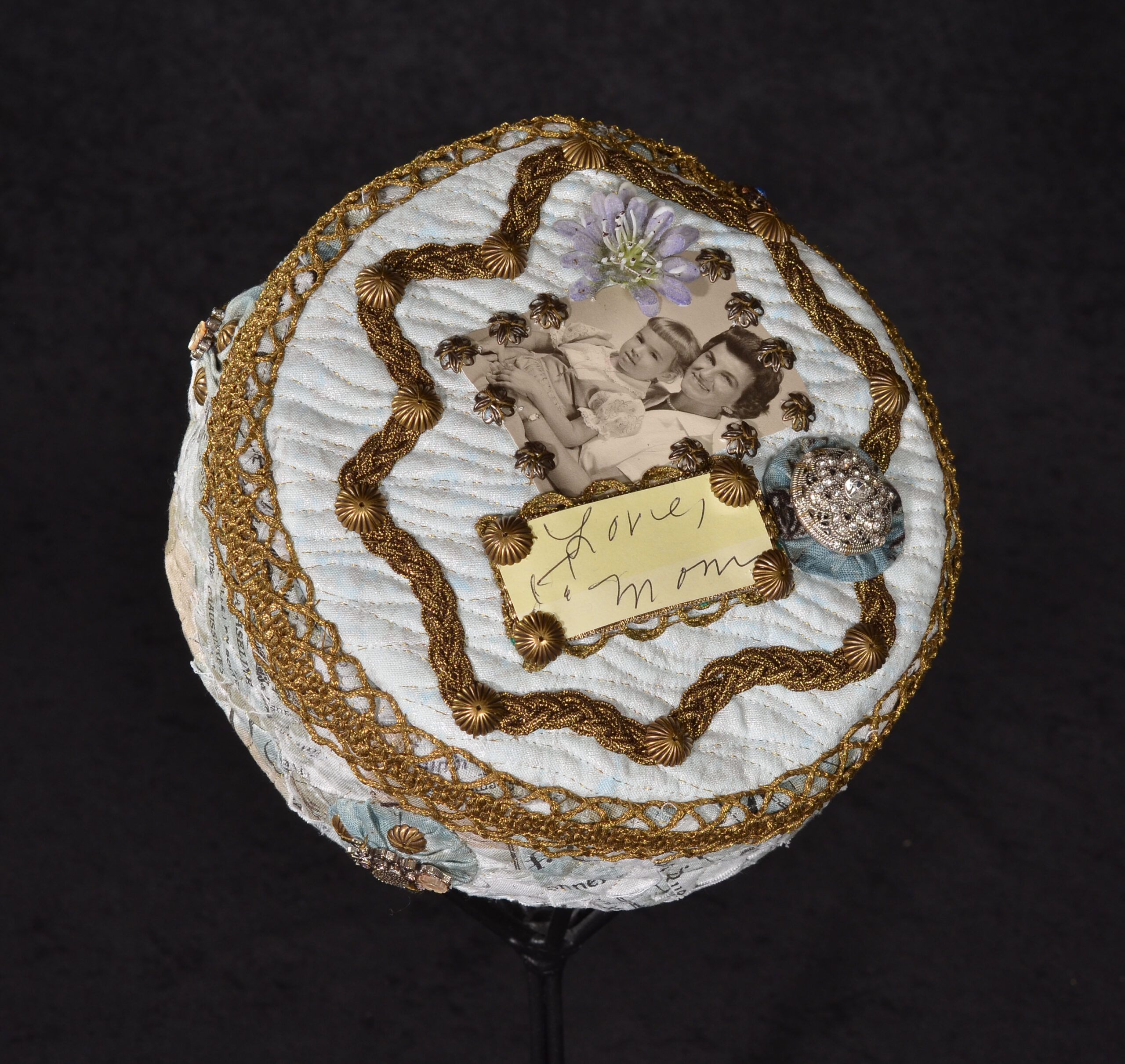 Image Statement: A pillbox hat, using my mother’s favorite color palette. Embellished with a photo of my mother and myself as a child, her signature from an old card, a flower from an arrangement and pieces of jewelry I had given her over the years. Vintage trim and beaded yo-yos complete the surface design.