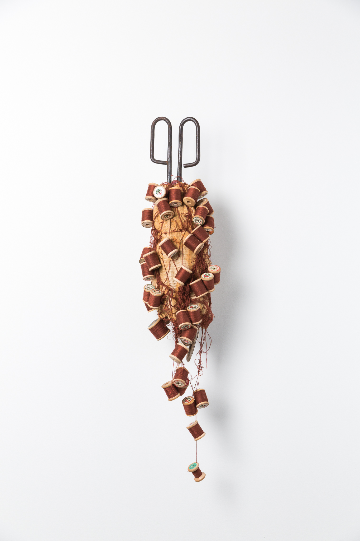 Materials: Shears, synthetic foam, rust print on linen, thread, wooden spool, fixing bracket, wood, screws