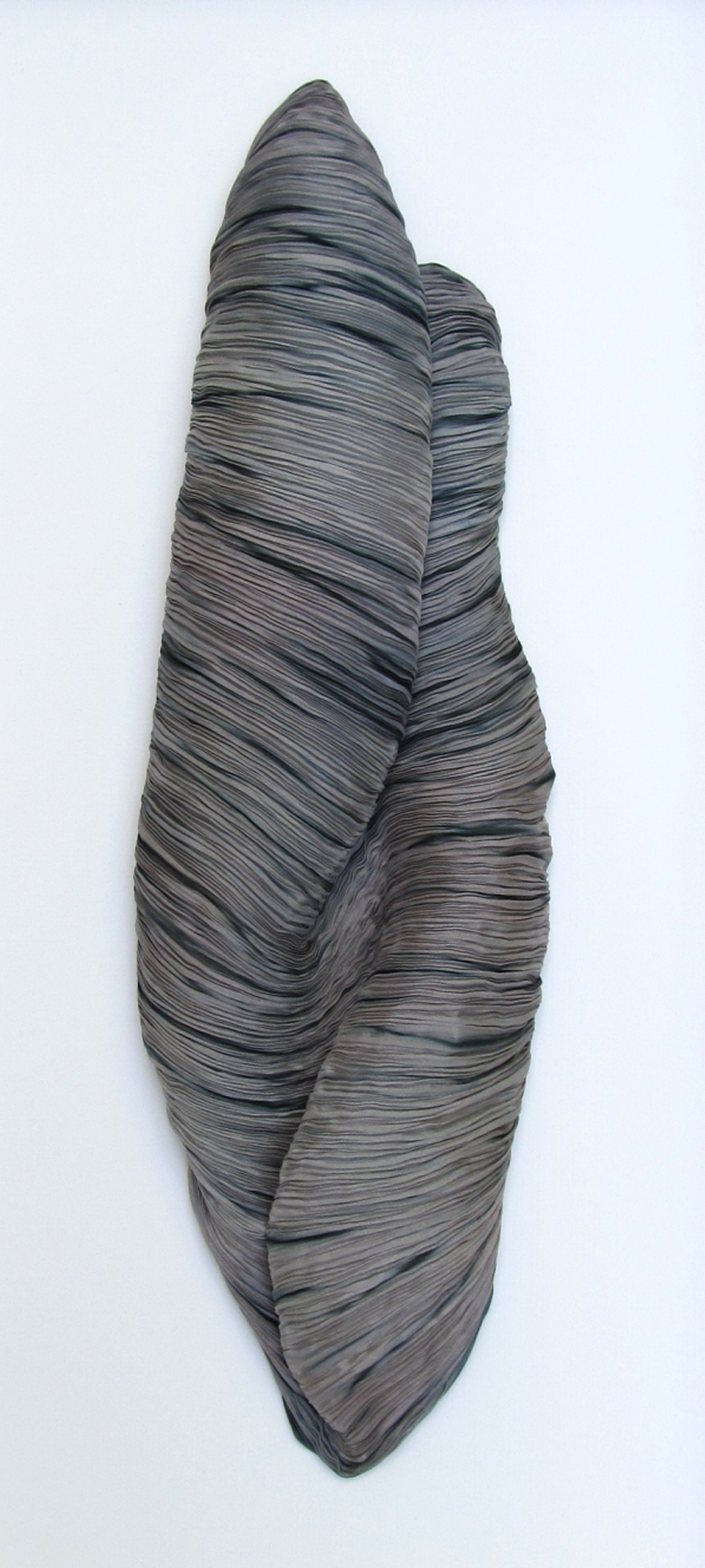 Image Statement: Amanita #3 explores the potential of using the texture and shading of shibori dyed and pleated silk as a sculptural medium. The texture created by the intricate thread bound, pole wrapped process has been captured in the silk fibre creating thousands of tiny knife edged pleats. The incredible 'memory' of silk makes this possible.