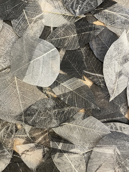 Image Statement: (Detail shot of the floor of my installation entitled Life Cycles) This is an installation that uses real skeleton leaves that have hand printed monotypes added to each leaf and suspended from the ceiling and on the floor.