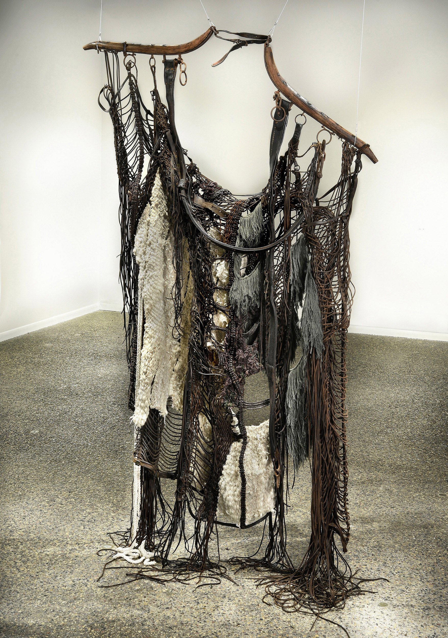 Materials: cotton, hemp, leather, linen, and wool on leather horse fly nets with hames (part of horse collar)