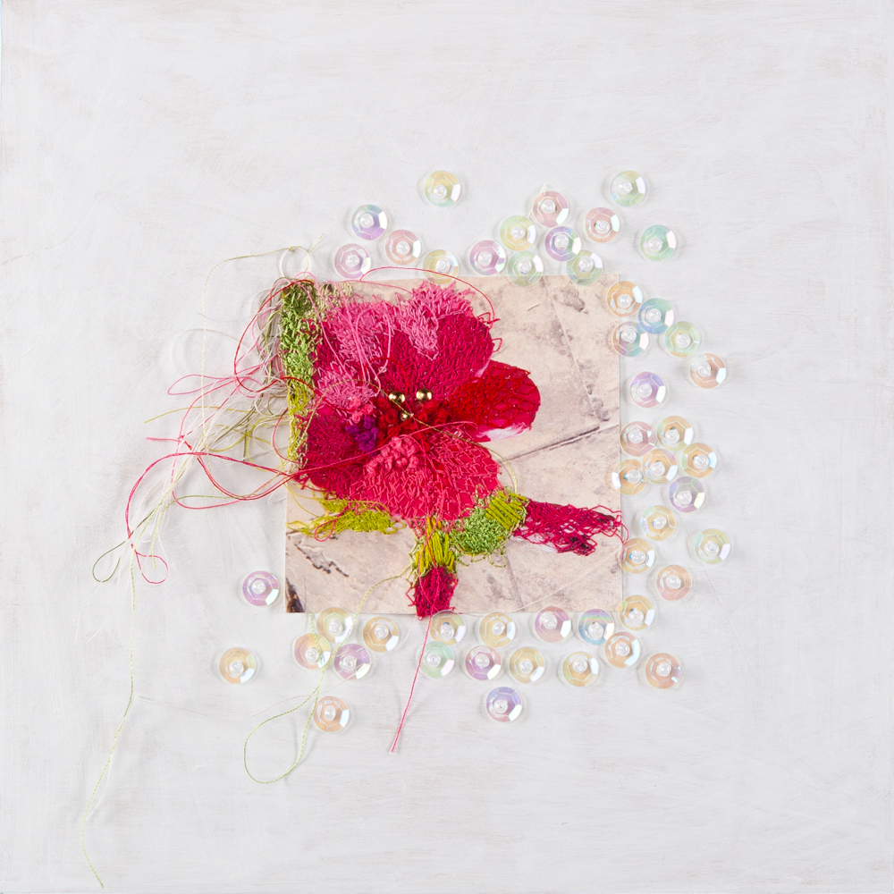 Materials: Hibiscus photograph embellished with hand & machine embroidery, beads, sequins, and nails mounted on top of a painted basswood panel