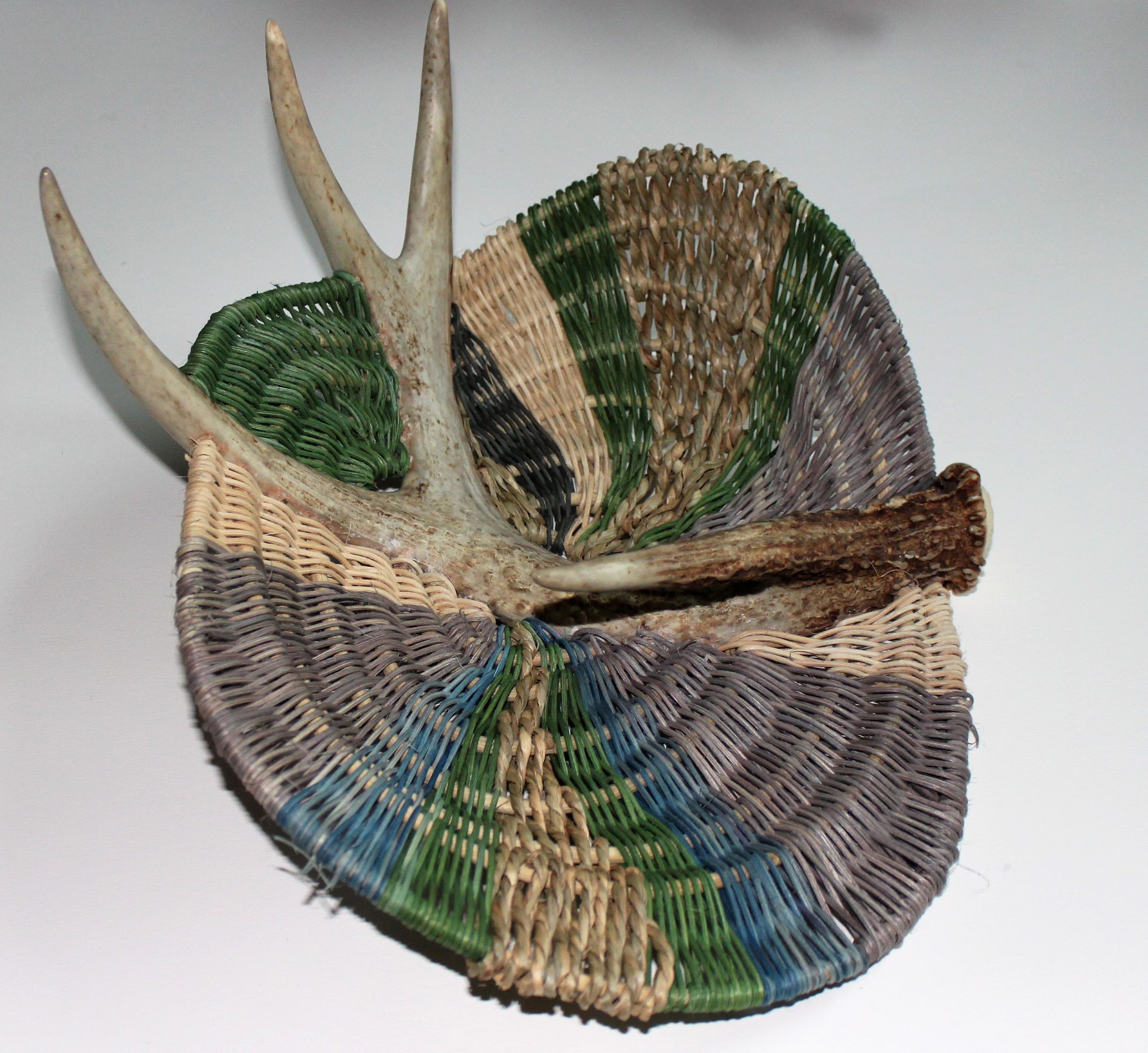 Image Statement: I learned this technique from Richard Gonzales, Iriquios Oneida Turtle Clan, he learned from an elderly Oneida member. I am harvesting shed antlers and using natural materials which I dye to document our shared history. This antler is from Kentucky; home to Cherokee,Chickasaw, and Shawnee. Reeds dyed with kudzu and other plant stains.