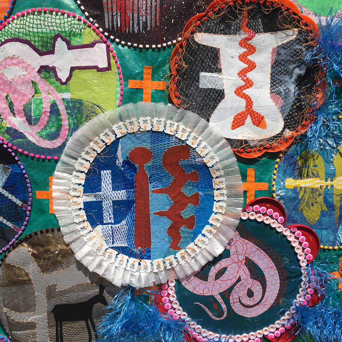 Materials: Mixed media. Hand sewn heat pressed plastics; embellished with screen-printing, glitter, beads and found objects.