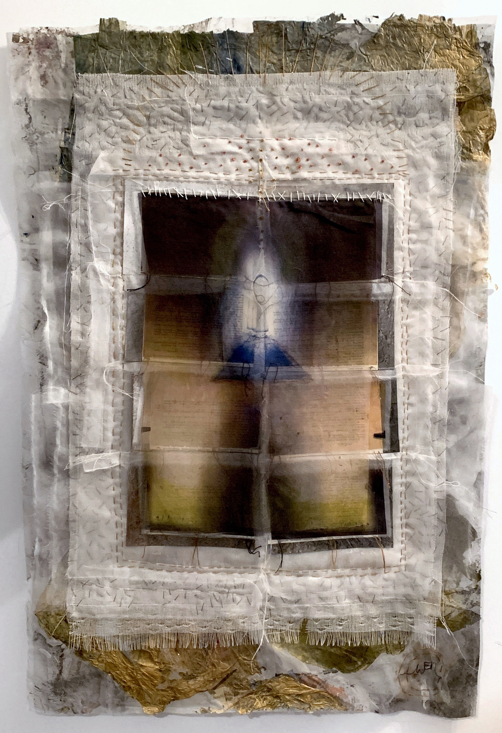 Materials: recycled book pages, artist printed digital silk organza, scrim, pearl cotton, stitched text, hand stitching.