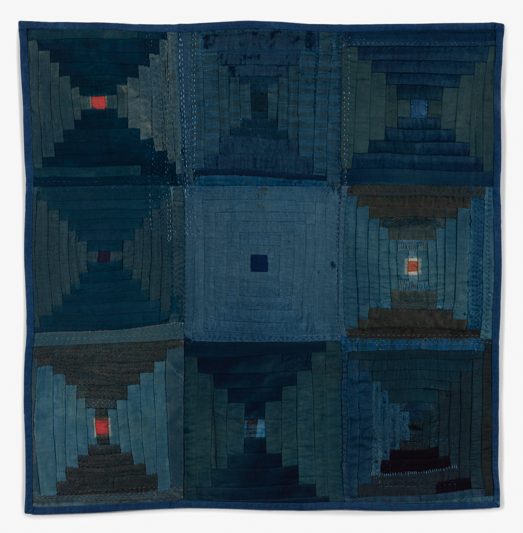 Image Statement: By a Thread Blue is part of a series of artwork originating from a tattered vintage courthouse step quilt. The blocks were separated, repaired, and over dyed, using natural dyes. They were then reassembled to create a new nine patch quilt. Each of the pieces have their own characteristics and color ways, and the handwork of the original makers is highly present and influential in the quilts’ reincarnation.
