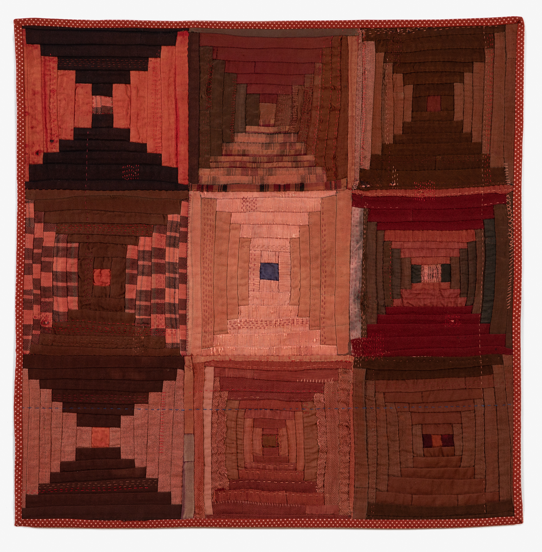 Image Statement: By a Thread Red is part of a series of artwork originating from a tattered vintage courthouse step quilt. The blocks were separated, repaired, and over dyed, using natural dyes. They were then reassembled to create a new nine patch quilt. Each of the pieces have their own characteristics and color ways, and the handwork of the original makers is highly present and influential in the quilts’ reincarnation.