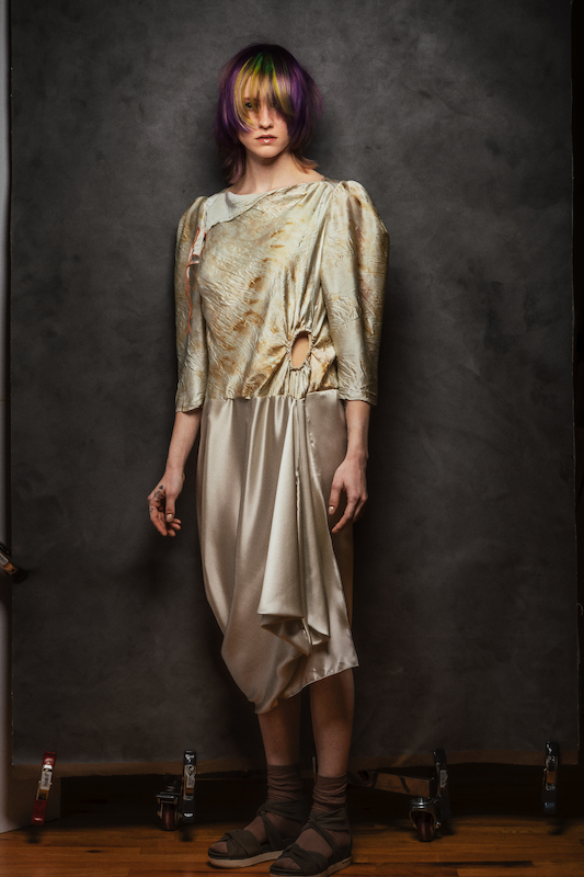 Image Statement: This one of a kind dress is dyed with botanicals from my garden. It is entirely draped on the form, we’ve added a peek a boo detail just in the right spot.