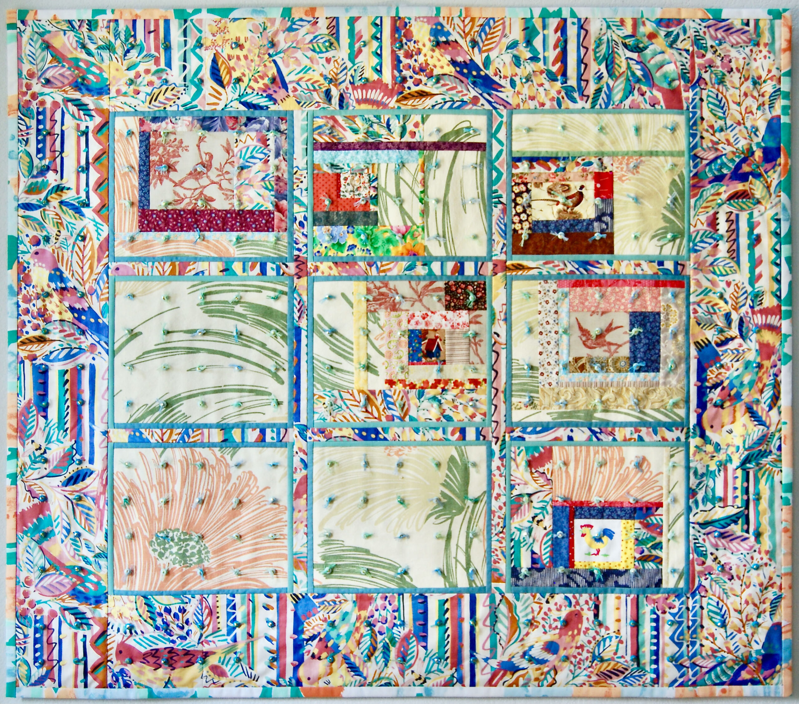 Materials: Found and recycled fabric, found beads, recycled sequins, found embroidery floss, thread, batting