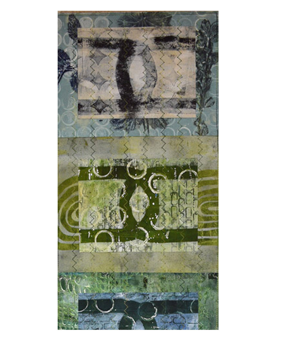 Materials: Monoprinted paper collage, mounted on canvas, machine stitched