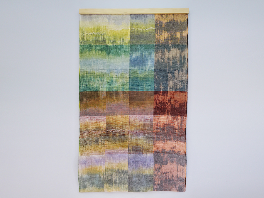 Materials: Hand woven wall-hanging panel made from hand dyed cotton, linen and tencel.