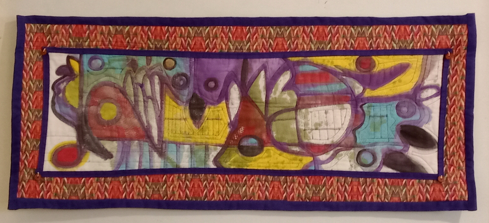 Materials: Acrylic paint, cotton fabric with cotton reproduction fabric of one of my V Pleated/tessellation acrylic paintings, machine stitching and quilting with unbleached cotton batting; cut rock beads.