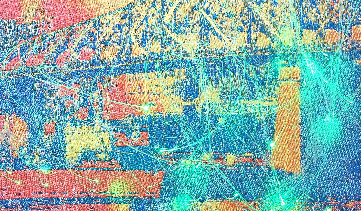 Image Statement: This is a detail of my tapestry that was inspired from the view of the Jacques-Cartier Bridge in the city of Monrtreal, Canada, on the Saint-Lawrence River. Since 1974 I weave textile art with lighting effects from fiber optics that are animated with a microcontroler that I programmed to make the colours change with the sound of clapping hands. This tapestry was woven on a TC2 Jacquard loom.