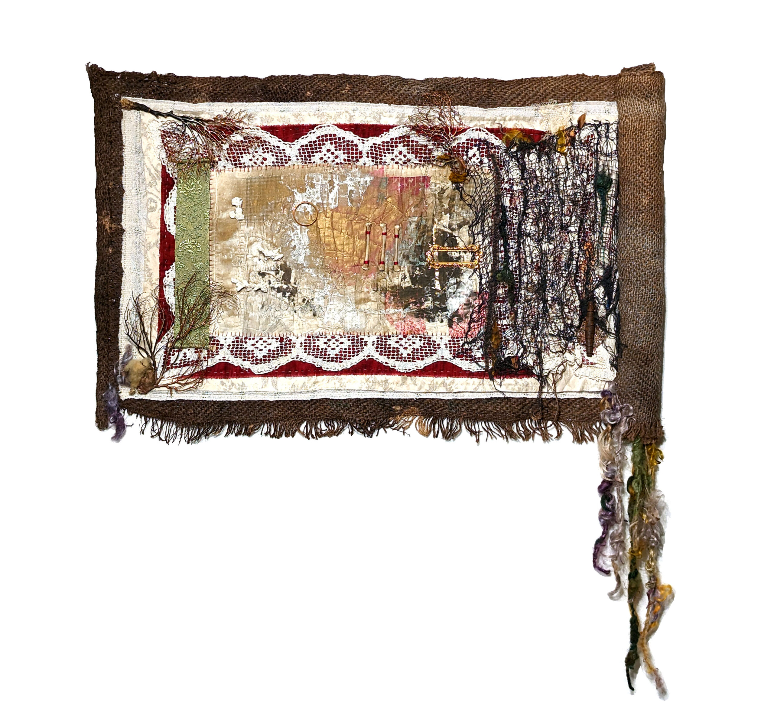 Materials: Washed ashore burlap, damaged quilt fragment, vintage dresser scarf, silk remnant, commercial cottons, cheesecloth, chicken bones, sea shells, rusted spring, dried sea algae, ephemera, hand spun wool yarn with human hair, vinyl spackling, India ink, spray paint, found objects.