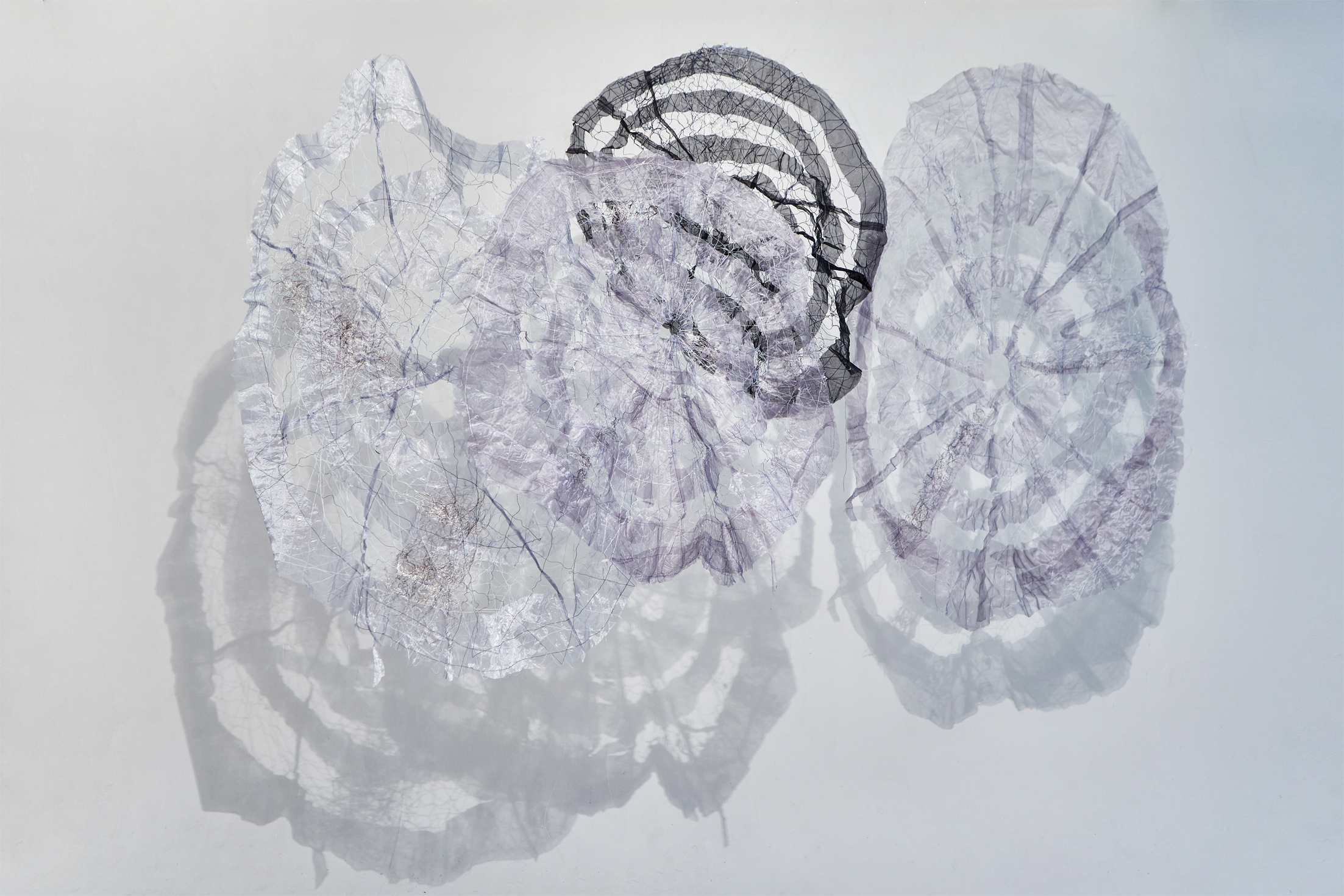 Image Statement: Modern people live without even having time to think about the essential meaning of true 'existence'. This work is an installation artwork that embodies an inner space where viewers can enter the space of the ‘fog’ and think about existence. Opaque, achromatic colored organza silk has cut into various shapes of various sizes and formed into a huge net, creating a reminiscence of spread fog. A light organza silk moves fluidly and forms irregular shadows. Viewers can feel as if they are inside the fog itself by entering spaces between units.