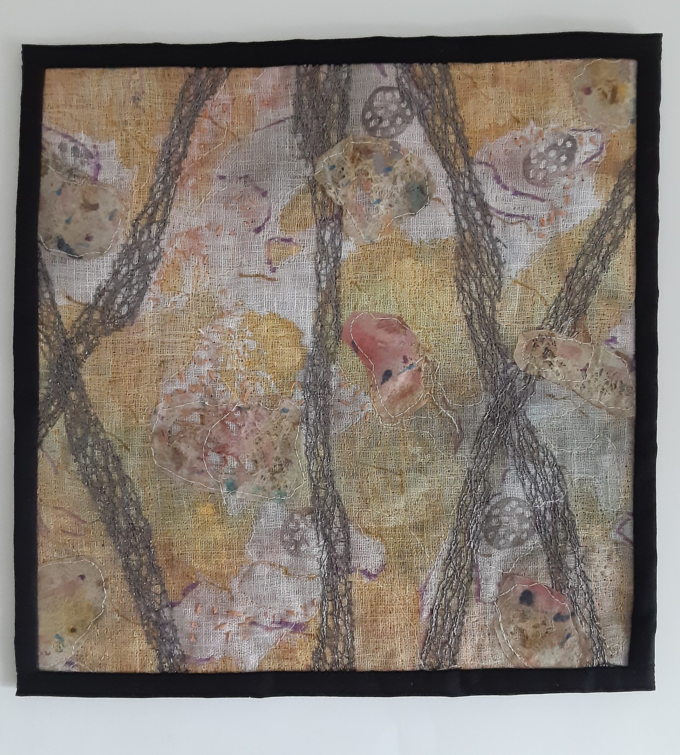 Materials: hand painted and inked linen, metallic web, lutradur, cotton/metallic embroidery thread