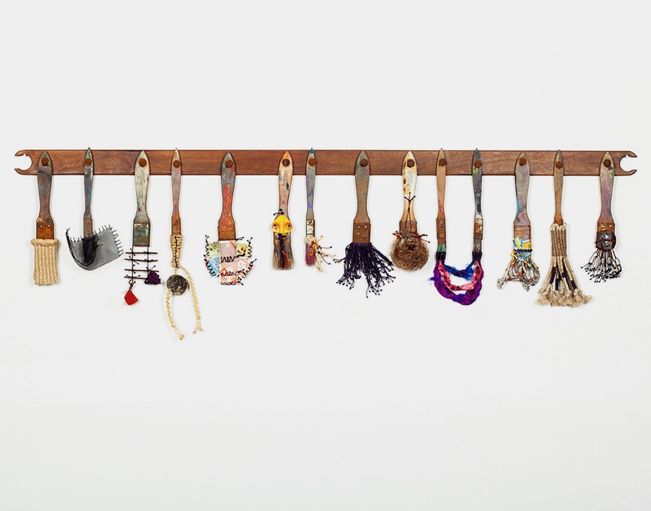Materials: Used paint brushes, Irish waxed linen, cordage, fabric, paper rush, hemp, wire, birds next, found objects