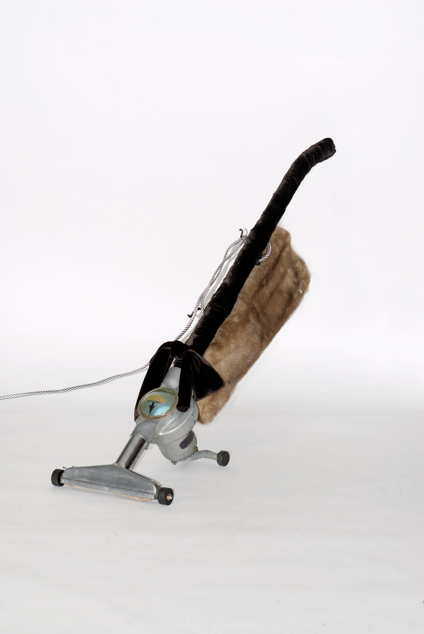 Materials: Vintage Airway Sanitizor 1927-era vacuum cleaner, mink stole, silk velvet ribbon, pearls.