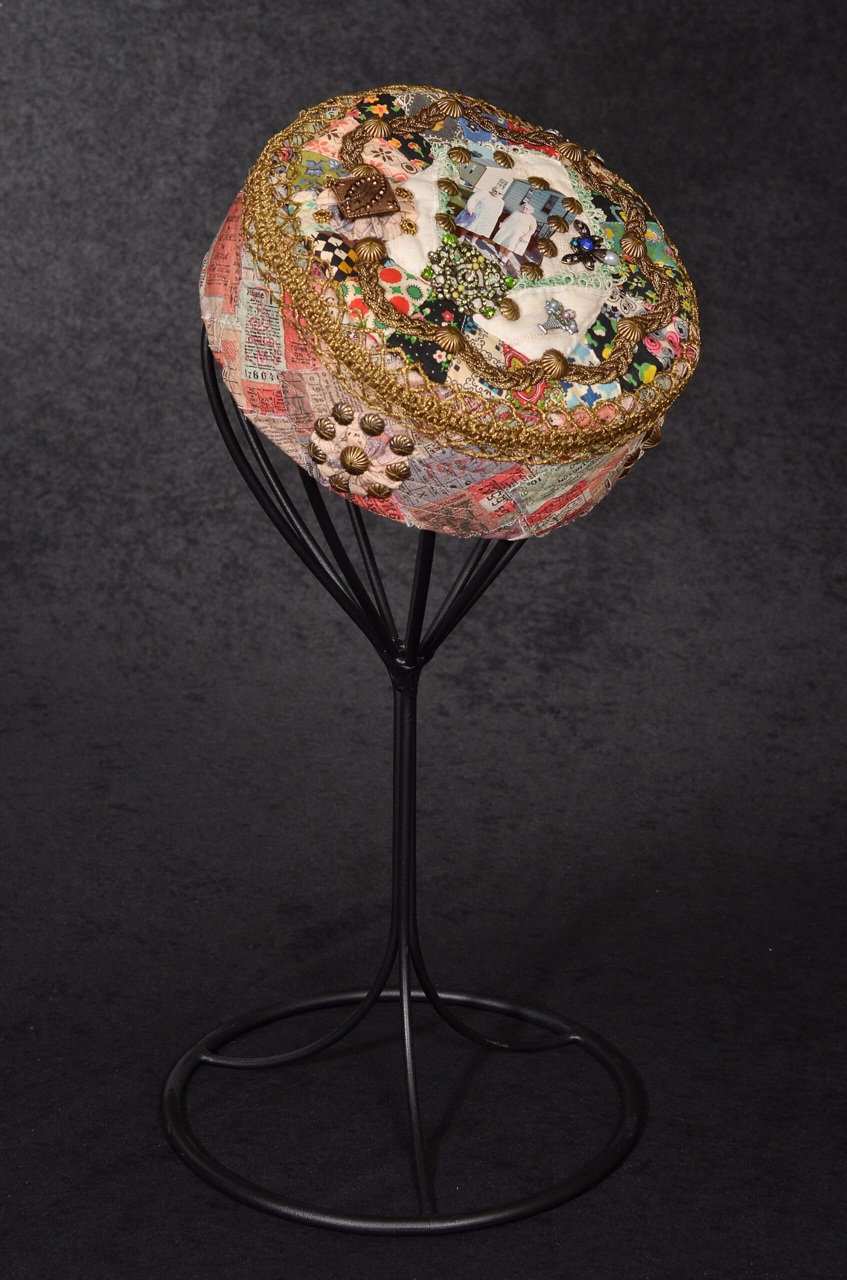 Image Statement: A pillbox hat dedicated to my Grandma-K who taught me the art of sewing. Designed incorporating her potholder, handkerchief, jewelry and photograph. Her hanky was tea-dyed and manipulated to border her photo, giving the appearance of an opened envelope. Vintage trim with beaded yo-yos and recycled jewelry completes the surface design.