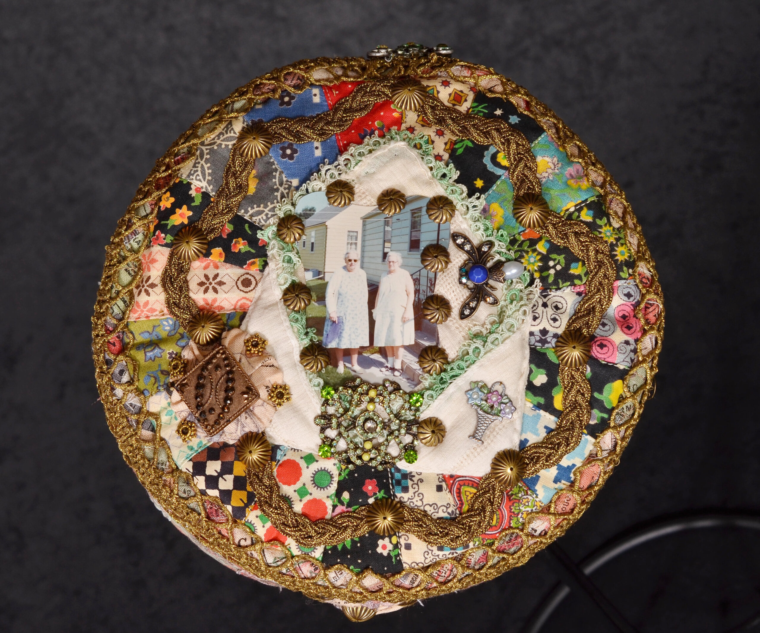 Image Statement: A pillbox hat dedicated to my Grandma-K who taught me the art of sewing. Designed incorporating her potholder, handkerchief, jewelry and photograph. Her hanky was tea-dyed and manipulated to border her photo, giving the appearance of an opened envelope. Vintage trim with beaded yo-yos and recycled jewelry completes the surface design.