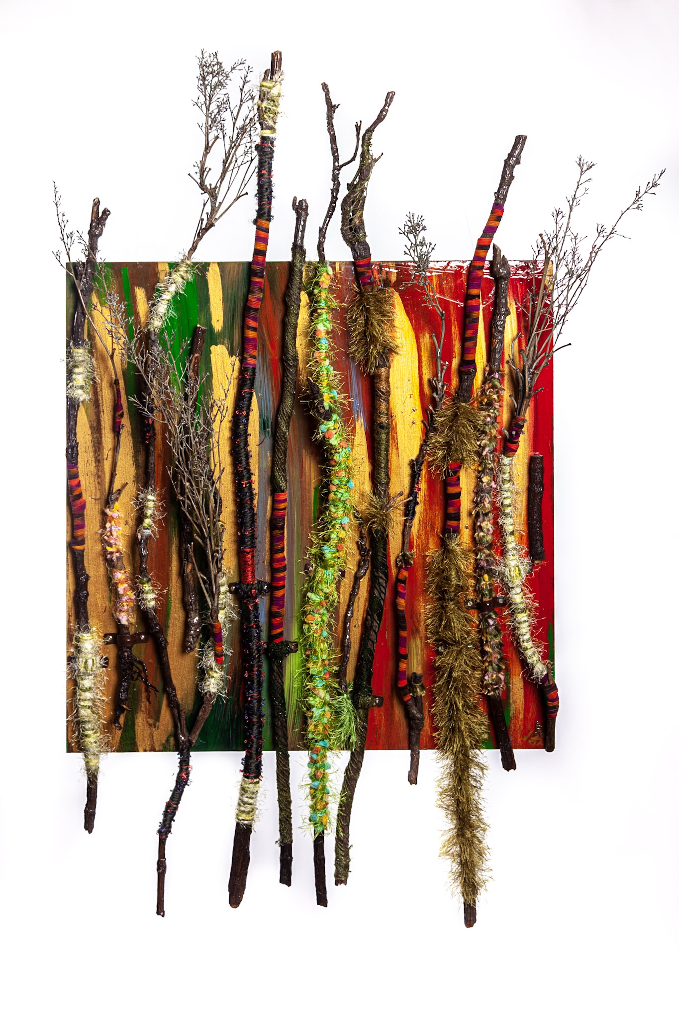 Materials: Wood, Nandia plant, fiber, acrylic, resin