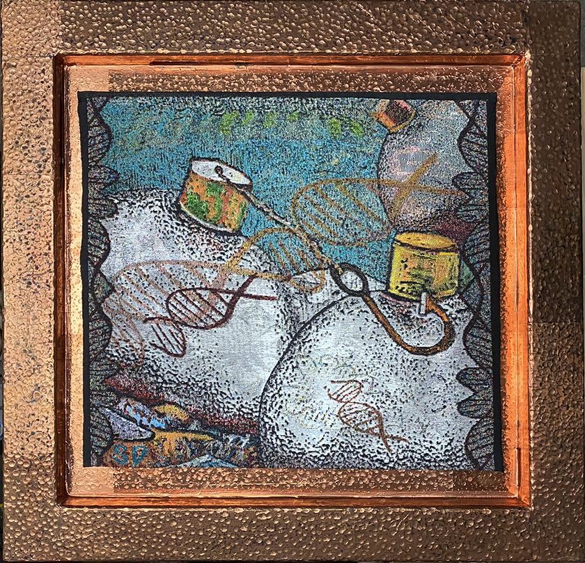 Image Statement: For most of my life I believed my family were Indigenous & French settlers from Canada, it wasn’t until several years ago that I discovered through a genetic test that this history was the strange invention of my parents. That genetic test indicated my family hailed from North Africa and Southern Italy. The discovery of this sent me down a rabbit hole to find even more fantastic fabrications. In most instances people have no reason to fact check their family history especially when the family agrees on it, and so these layers become who you think you are. This series which is in progress, begins with “Who do I think I am”, “Broken Pickets” and “I was two Bobs”. These are my personal metaphors indicating that something here isn’t quite right. After first doing a genealogical search it appeared that the family truth was imagined, but what led them to this remains a mystery to me. The somewhat disruptive beauty of the work holds the viewer, a need for interpretation leads to a deeper look as I continue to dig through history.