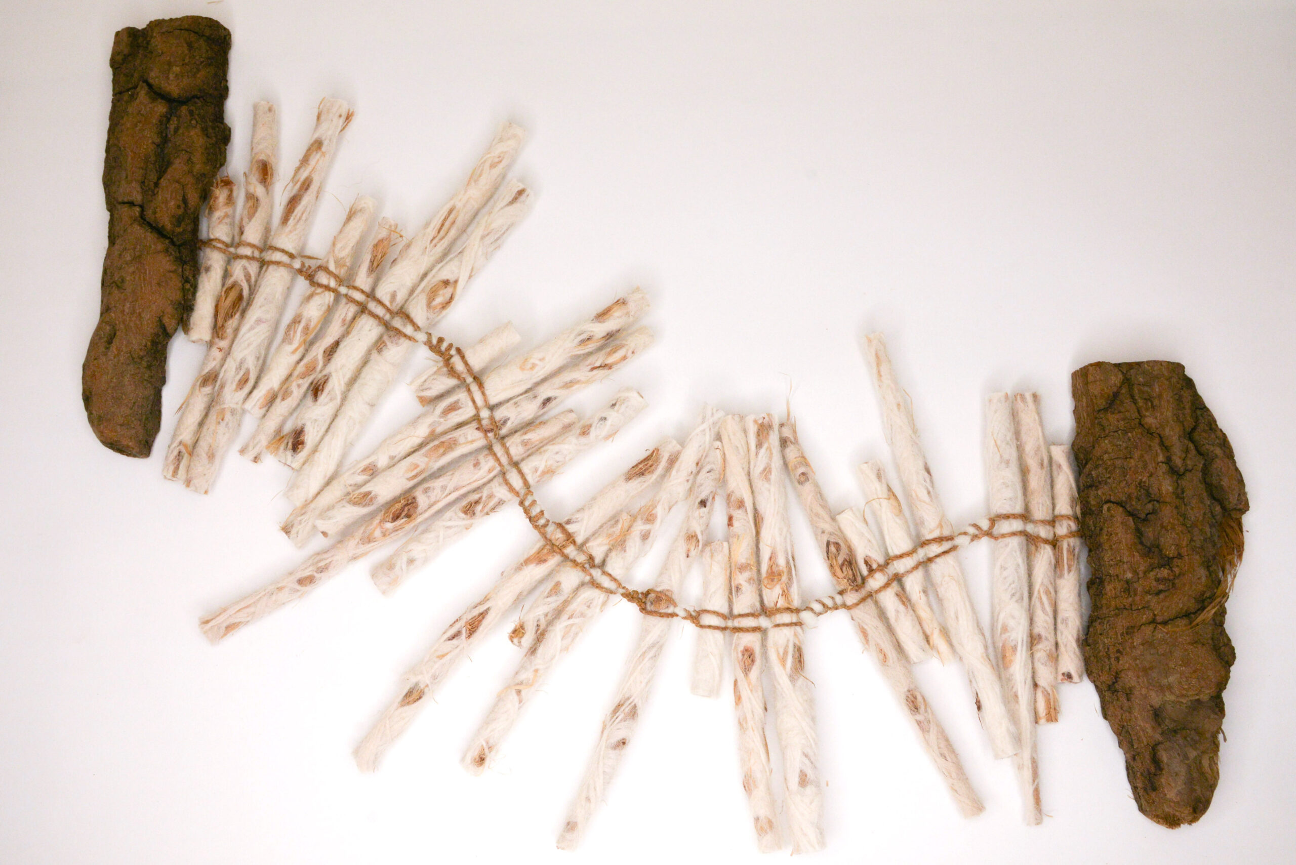 Image Statement: Sculpture composed of fibre from a single piece of storm-worn lá:yelhp (Halq'eméylem for Douglas Fir). Longer strands of bast became cordage. Shorter strands were felted with wool into log shapes, cut, joined together with handmade cordage, and held again between their own bark. 100% biodegradable.