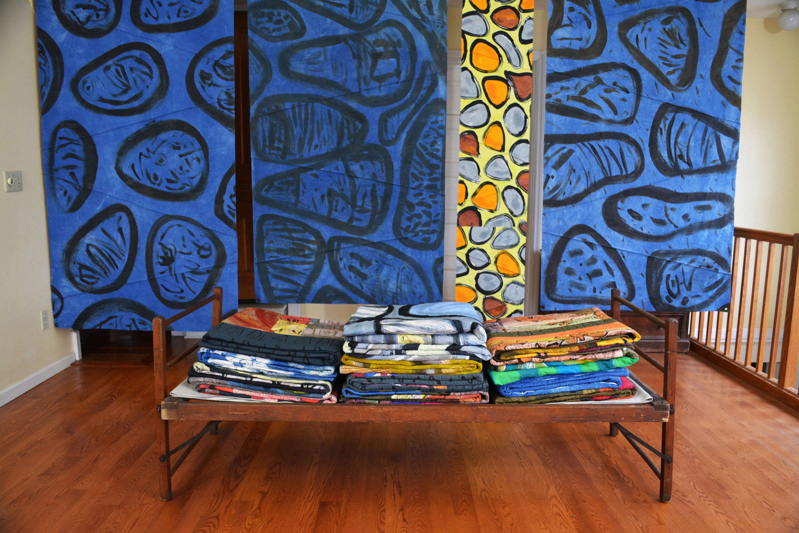 Materials: Installation in various forms with hanging elements and/or stacked 80x80" quilts, vintage cot or table. Indigo and fiber reactive dye on cotton broadcloth, matte medium & stitching, vintage cot