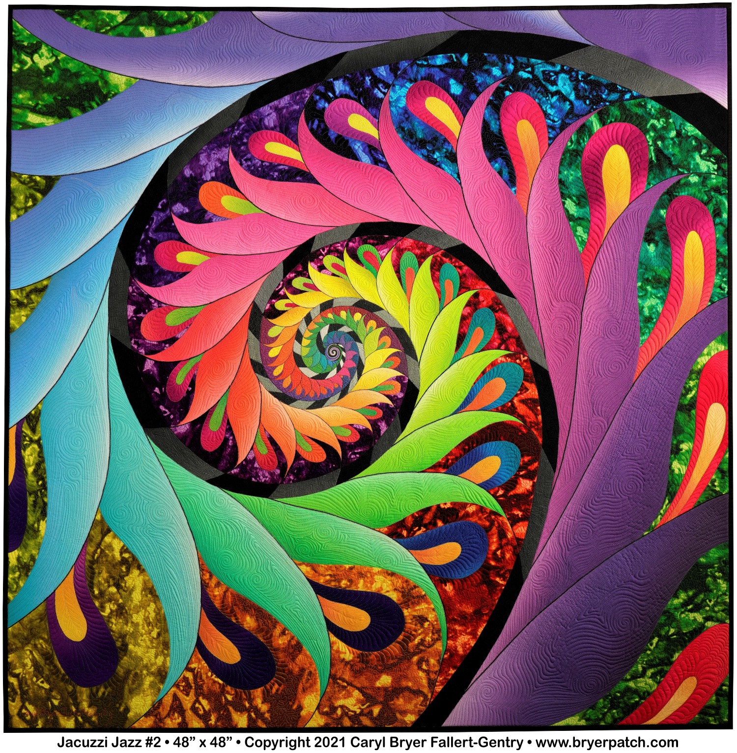 Image Statement: This spiraling color study was inspired by fractal designs. Petal shapes, which ombre from light to dark, were cut from colored rectangles that were digitally painted and sized to each template. Bud shapes were pieced and appliqued in contrasting colors. The background fabrics are from my “Color Flow” collection for Benartex, and they also gradate through the spectrum, with the same green in opposite corners.