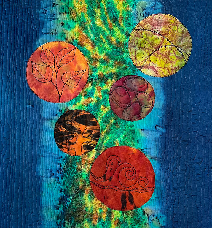 Image Statement: Participating in a “UFO” challenge with a group of fiber artists. We blindly exchanged identical brown bags of someone UFO and had to create new art from someone unwanted art. I got 3 circles and 2 triangles sewn with batting in them. I took them apart and created circles. I took one of my own older pieces that I had experimented using rock salt on painted silk. I machine appliquéd the pieces of dyed cotton then free motion quilted on it. Each circle represents the element around where I live. Plant, sea, fire, glacier rocks and rain. Featuring life and bringing new life from unfinished art.