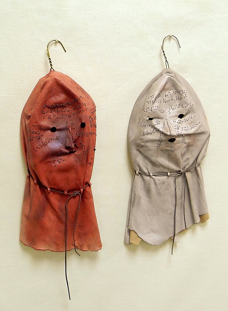 Image Statement: Two wearable handsewn leather masks are embroidered with beads and pearls representing braille text. The transcribed text is a pair of love poems that the wearers can read by touching each other's faces.
