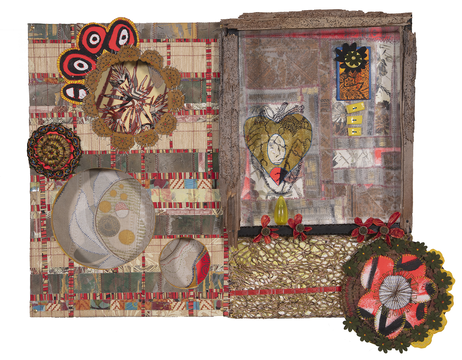 Materials: found & altered papers, old shoe, appropriated artwork, thread, buttons, beads, staples, wood, linen, basket, broken pottery, bulb