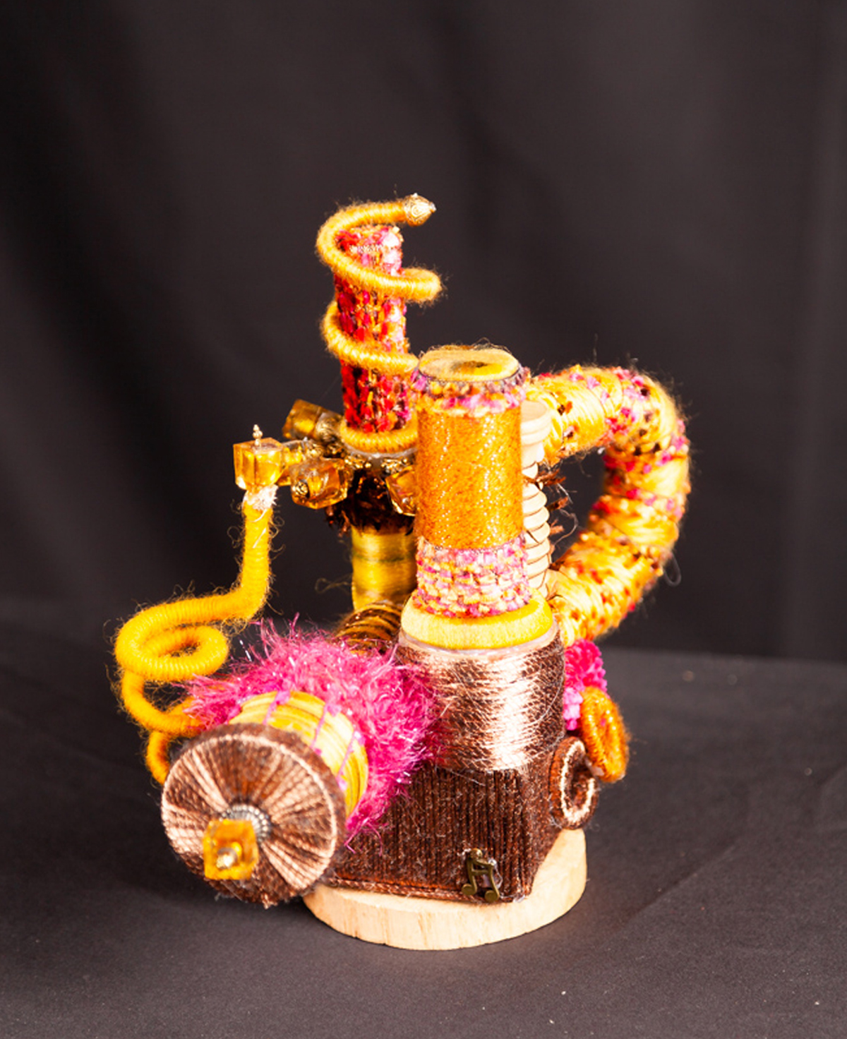 Image Statement: Using repurposed bits and pieces and painting them with fiber I am representing the golden age of industrialization. My multimedia, multifaceted piece draws attention to the inventive nature we have come to enjoy and depend upon. You the viewer can just imagine the moving parts as it spits and sputters to create a product that we believe we so desperately need. Repurposed wood and wire wrapped with fiber accentuated with glass beads assemblage.