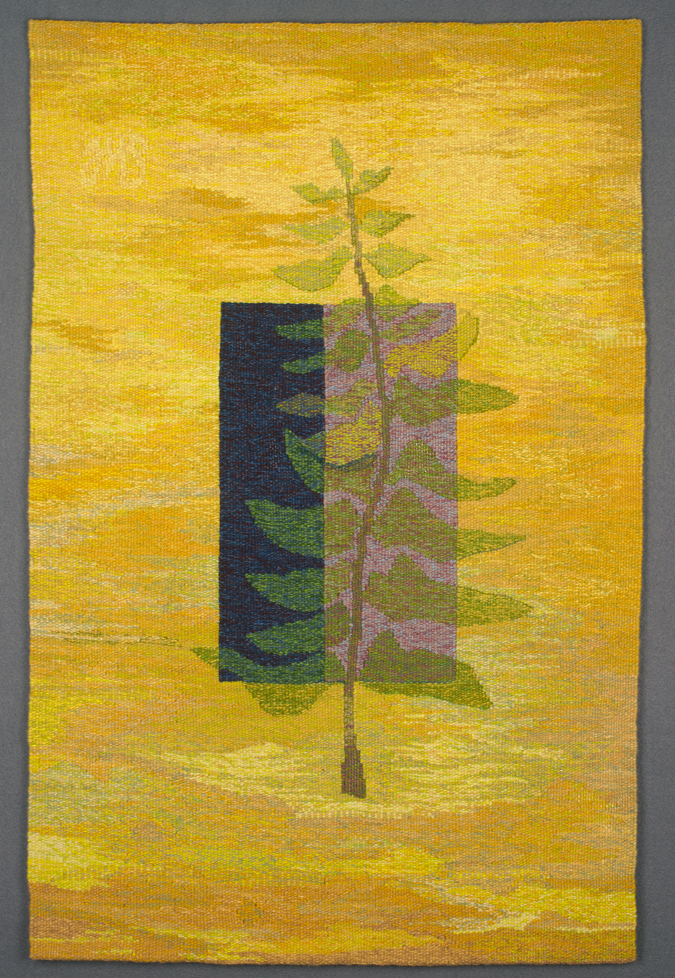 Image Statement: Memories of Ferns was done at the end of 2020, the first tapestry of larger size that I was able to complete during the first year of the pandemic. I wanted to evoke a sense of loss by making the fern frond transparent. I've used dark/light rectangles in other works to signify departure. By combining these two ideas I expressed a little of my feelings of helplessness about the state of the world's health.